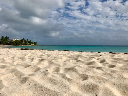 Beautiful untouched sand beach in Barbados (Caribbean Island) with blue sky and white clouds