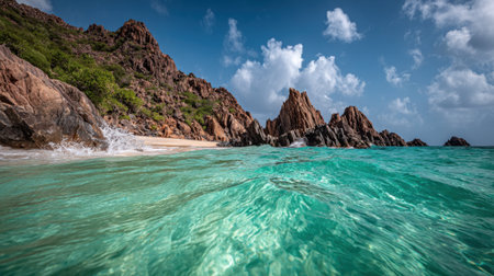 A low-angle shot from the surface of the clear turquoise ocean, looking towards a sandy beach and dramatic, rugged rock formations under a blue sky with clouds.