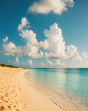 This stunning image captures a serene tropical beach featuring turquoise waters gently lapping against pristine white sand. The vibrant blue sky scattered with fluffy clouds creates a tranquil atmosphere, perfect for relaxation and vacation dreams.