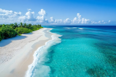 Breathtaking view of pristine white sand beach in Maldives. Turquoise waters of Indian Ocean lap gently at shore, creating serene idyllic scene. Sky is vibrant blue, dotted with fluffy white clouds