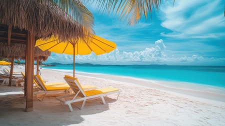 Bright yellow chairs and umbrellas on a sandy beach beside a vibrant blue ocean,.