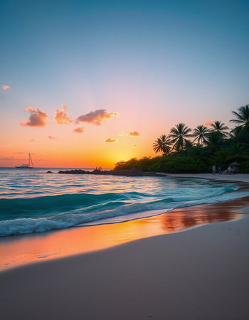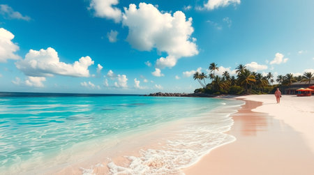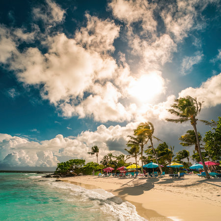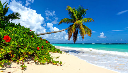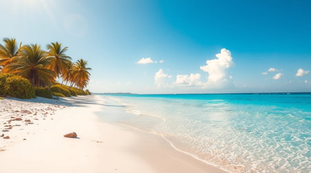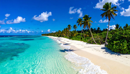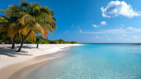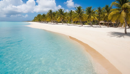 A breathtaking view of a tropical beach with pristine white sand, turquoise waters, and swaying palm trees. The image evokes a sense of tranquility and paradise, inviting viewers to escape to a serene tropical destination.