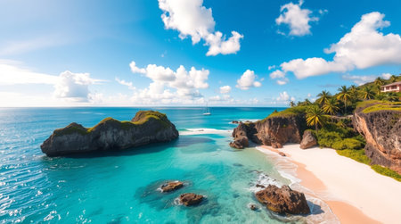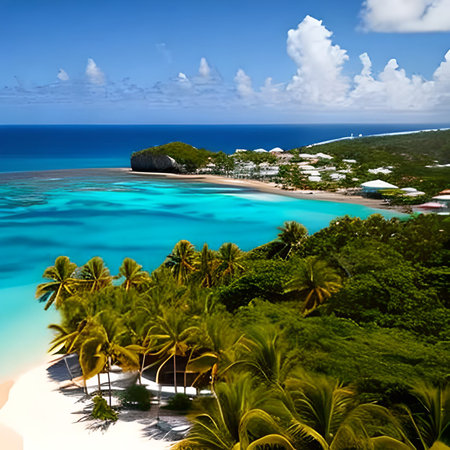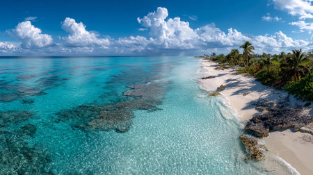 Crystal clear waters and sandy beaches stretch along the coast under a bright blue sky with fluffy clouds in a tropical paradise