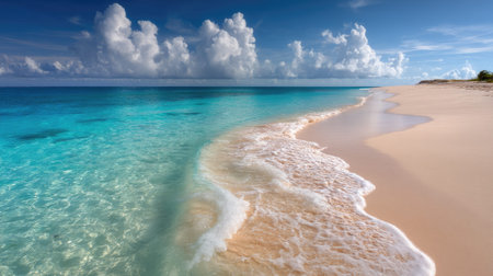 A clean white sandy beach stretches under a vast blue sky, with clear turquoise waters sparkling in the warm sunlight. Soft, foamy waves gently lap the shore perfect for eco-tourism posters or media.