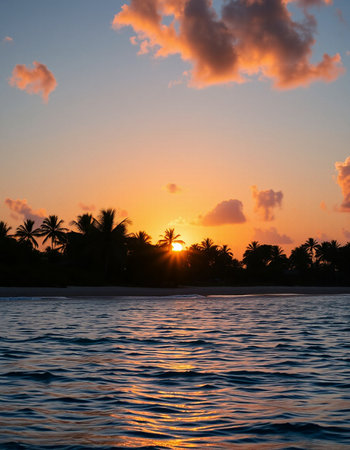 Golden sunlight reflects on calm waters as the sun sets behind palm trees, creating a serene beach atmosphere in the evening.