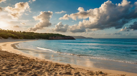 AI Generated. Sunny Beach with Golden Sand Turquoise Ocean Blue Sky Fluffy Clouds Beautiful Summer Vacation Paradise