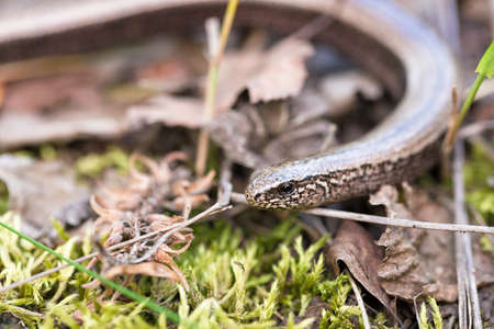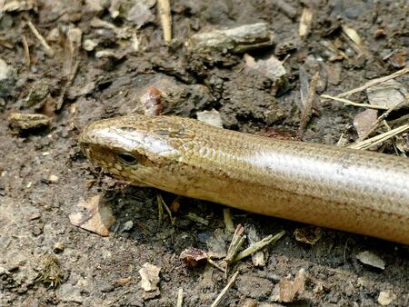 close-up on a blindworm on the ground in early spring