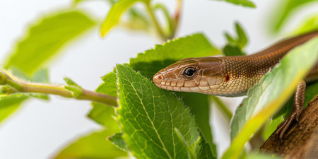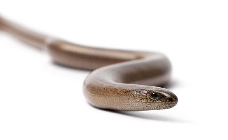 European legless lizard resembling a snake is stretched out on a clean white background. The soft lighting enhances its smooth scales and distinctive facial characteristics.