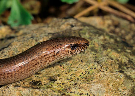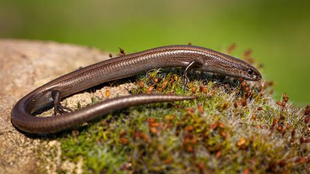 Slow Worm or Blind Worm, Anguis fragilis. Slow Worm lizards are often mistaken for snakes. His food is generaly pest insects. Shallow focus to eye. Czech nature and wildlife