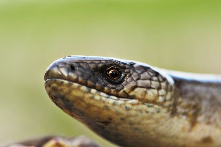 Juvenile slow worm ( Anguis colchica ) in detail. Portrait of eastern slow worm - the lizard often confuse for snake. Shallow focus to animal eye
