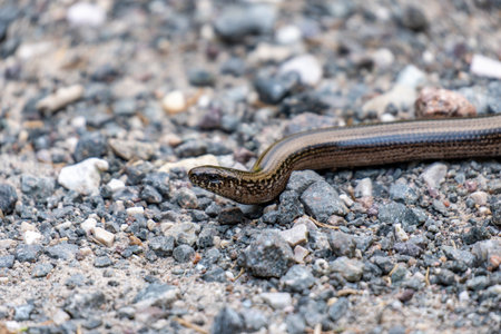 Slow Worm or blind worm, Anguis fragilis on a forest path. Amersfoort, the Netherlands. 2021. The kind of lizards often mistaken for snakes.