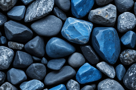 colorful rocks, arranged on the beach, showcase a stunning combination of dark indigo and light amber hues. with highly polished surfaces, these nature-inspired pieces feature a captivating blend of dark gray and light blue tones. the use of a sabattier filter adds a unique touch, enhancing the rounded shapes and vibrant colors of the rocks. ai generated