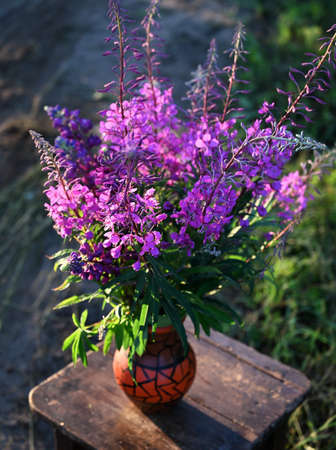 beautiful bouquet summer flowers Ivan-tea or blooming Sally in rays of evening sun. Medicinal plant willow-grass in vase in open air on background green foliage. Wildflowers