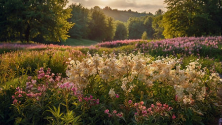 Beautiful blooming meadow in the morning light. Beautiful summer landscape.