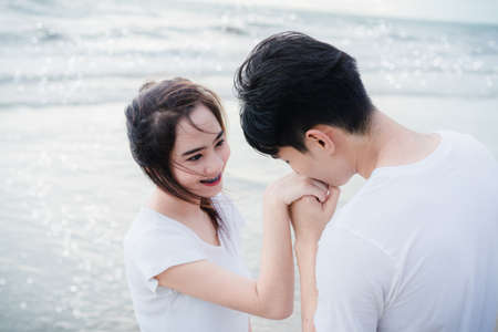 Asian couple traveler in white shirt holding hand walking on the beach.