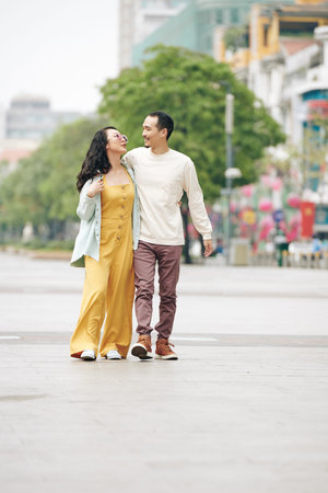 Young Asian couple walking along street with shopping bags looking at their reflection in glass window of mall building