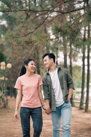 Young Asian man in love looking at his girlfriend when they are resting outdoors