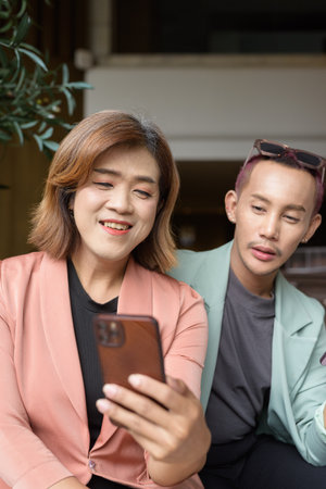 Asian transgender woman and non-binary coworkers working remotely in cafe