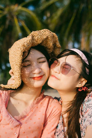 Portrait of Beautiful Asian girls with Ao Dai vietnam traditional dress on Sunset landscapes.