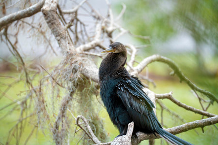A big anhinga bird resting on tree branch in Florida wetlands