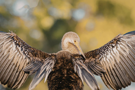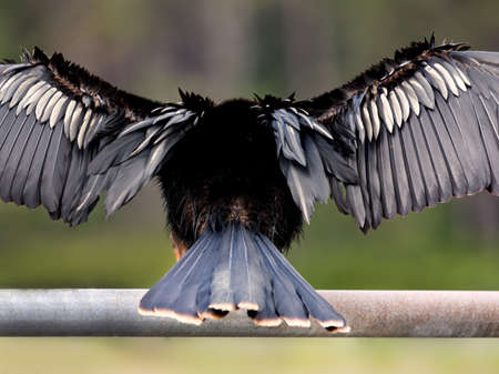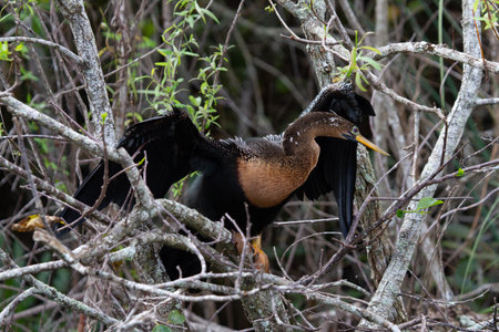 Spread wings of an Anhinga anhinga bird in a swamp in Naples, Florida.