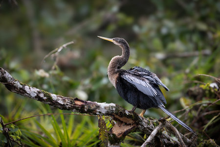 Anhinga anhinga drying and perching on a branch in Tortuguero, Costa Rica