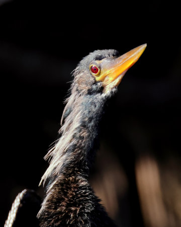 This close-up captures the unique features of an anhinga, highlighting its sharp beak and intense gaze