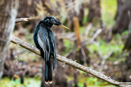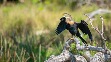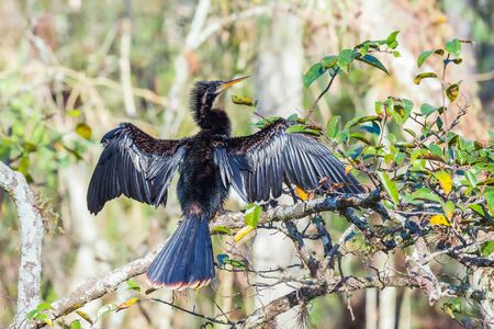 Anhinga perched on a branch while stretching and drying its wings. Found in Everglades