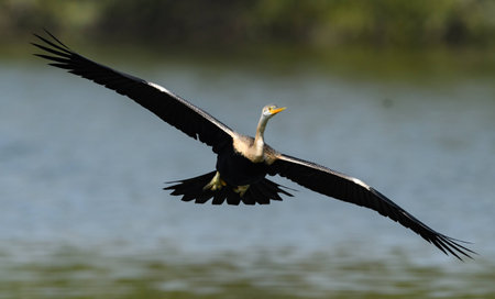 Oriental Darter or Indian snake bird (Anhinga melanogaster) in flight over the river.