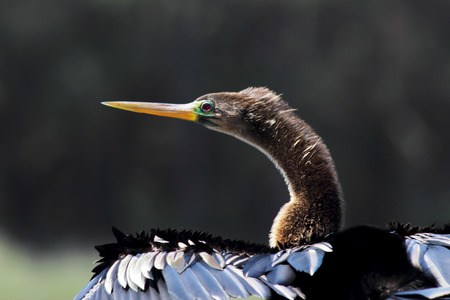Closeup of an Anhinga, (darter), with it's neck outstretched drying out its wing feathers after fishing.
