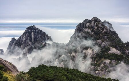 beautiful granite pillars and peaks in cloud fog, mount sanqing at dusk, jiangxi province, China