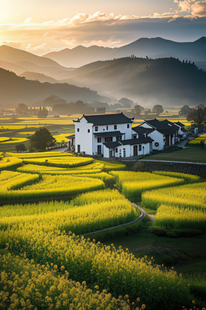 Rapeseed fields in Hui-style villages, Chinese countryside in idyllic paintings