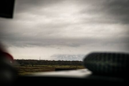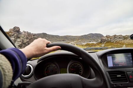 View from car window on the road and pity strange landscape with a mountains, rocks and cloudy sky and hand of woman. Landscape through windscreen in Norway.