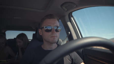 man driving a car at sunset-dawn, close-up, blur. Concept, road trips and travel, freedom of movement.
