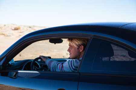 Man driving on road trip, Tuba City, Arizona, USA