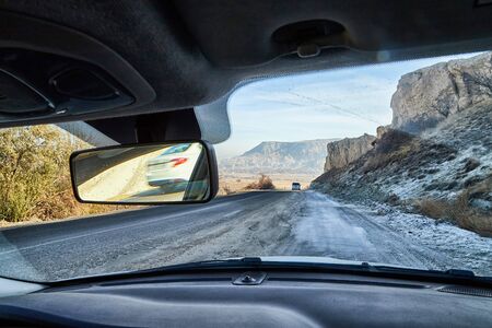Driving car on the desert road, view through the windshield on the beautiful mountain road on a dusk