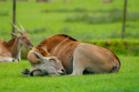 Eland antelope on green grass in the zoo. Wildlife scene from nature.