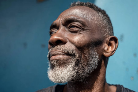 A man with a beard and a black face is wearing a necklace. He is looking at the camera with a peaceful expression