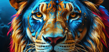 A close-up portrait showcases a lion with a prominent mane. The image features a blue color palette with glowing light effects, creating a dramatic atmosphere. The animal is the focal point, emphasizing its noble features. Ideal for illustrations, conceptual design, or editorial projects.