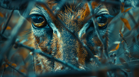 close-up view of an antelopes eyes, partially obscured by branches, suggests a moment of quiet observation in the heart of the African wilderness.