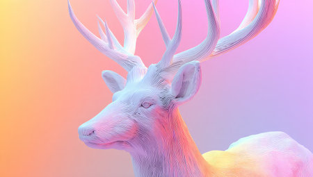 A digital art piece displays a white deer with prominent antlers. The subject is set against a soft, colorful gradient background. The composition shows the deer from the chest up, with smooth textures and subtle lighting creating a gentle aesthetic. This artwork is suitable for various commercial or artistic purposes.