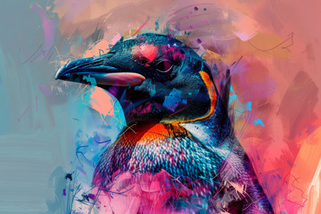 A striking depiction of a colorful bird is captured against an abstract backdrop filled with vibrant hues and dynamic patterns