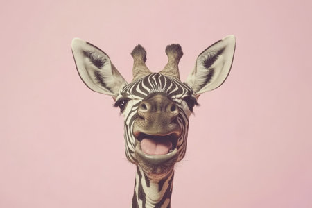 Playful zebra-giraffe hybrid with a humorous expression on a pink background.
