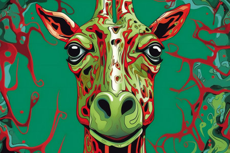 Giraffe head on a green background with red and green spots