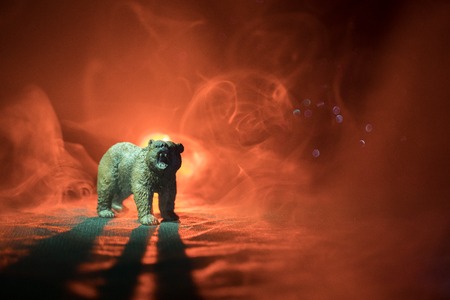 Angry bear behind the fire cloudy sky. The silhouette of a bear in foggy forest dark background