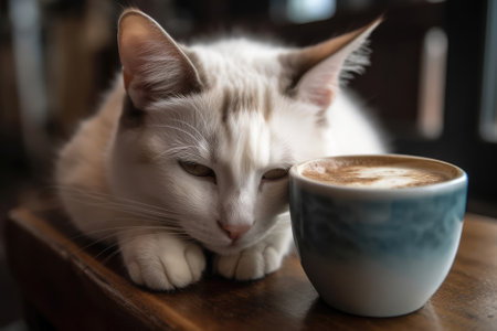 A cat wearing a hat sitting next to a cup of coffee. AI generative image.