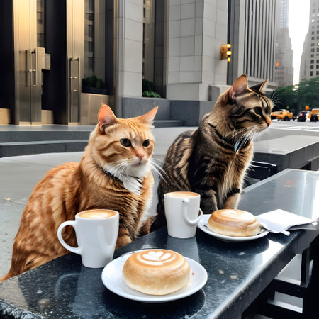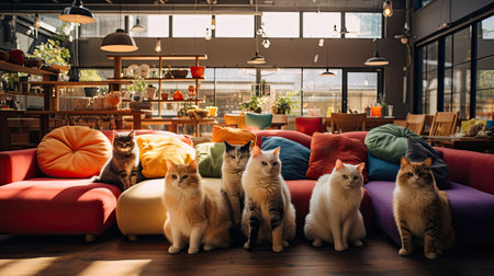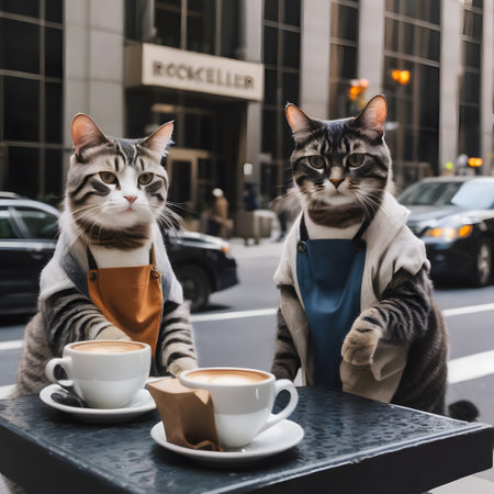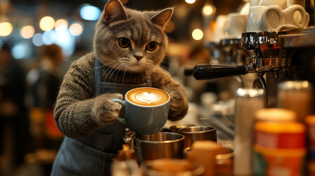 Cat diligently prepares latte art in a cozy cafe filled with people during the afternoon. Generative AI
