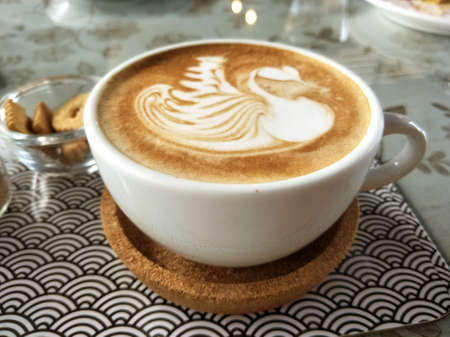 Morning Coffee latte on white cup, a coffee shop cafe on wooden table.