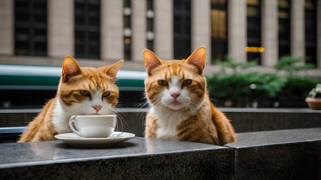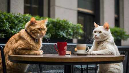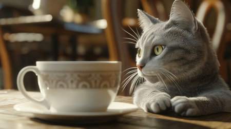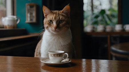 Cat dressed in human clothes, sitting at a table in a domestic setting and enjoying a cup of coffee. Evokes warmth, relaxation, and the simple pleasures of life.. Generative AI Technology.