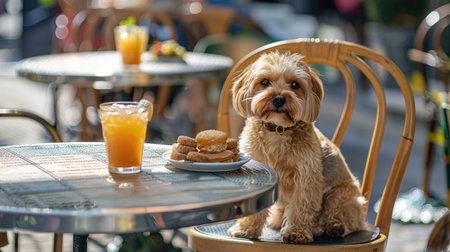 Friendly canine relaxing at a cafe table set with tasty treats and refreshing drinks